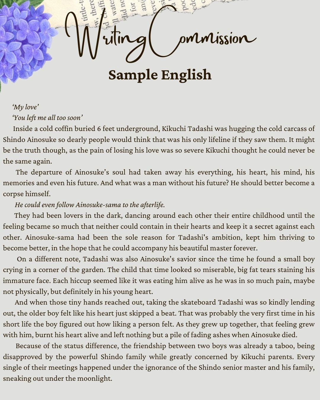Please DO NOT use my writing commission for profit or commercial purpose. If customers want to use them for commercial purpose, please discuss with me beforhand so we can work out a different price.
